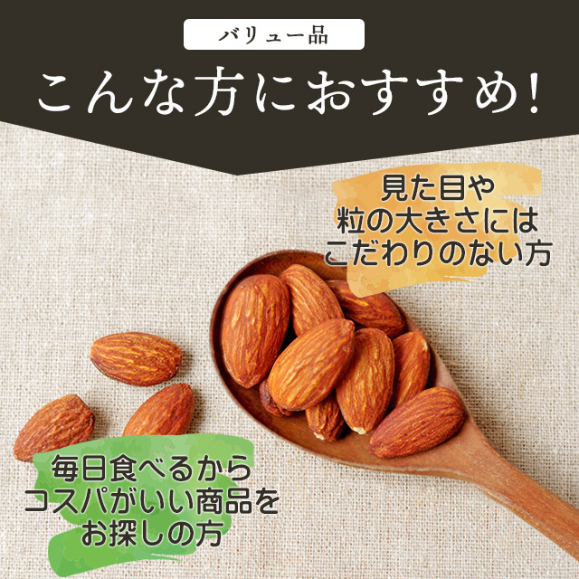 製法は同じで味や食感に違いは感じません(味は主観によります)。見た目や粒の大きさにはこだわりのないお客様、毎日食べるからコスパの優れたアーモンドがいい!というお客様にはおすすめの経済的なアーモンドとなっています。ぜひ一度お試しください。