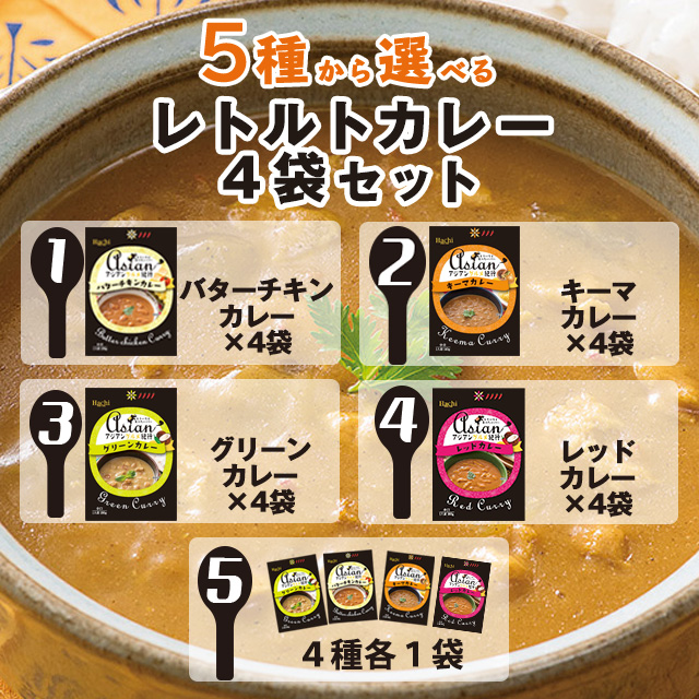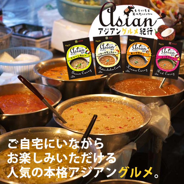 ハチ食品のアジアングルメ紀行シリーズは、ご自宅にいながら本格アジアンカレーをお楽しみいただける人気のレトルトカレーです。選べるカレーは人気の4種類。5つの組み合わせからお選びいただけます。