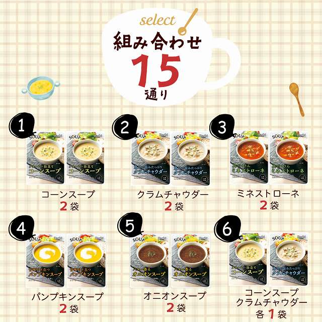 ハチ食品の人気シリーズ「スープセレクト」の定番4種類「コーンスープ」「クラムチャウダー」「ミネストローネ」「パンプキンスープ」に新商品「オニオンスープ」を加えた5種類を15通り組み合わせからお選びいただけるお試し2袋セットです。