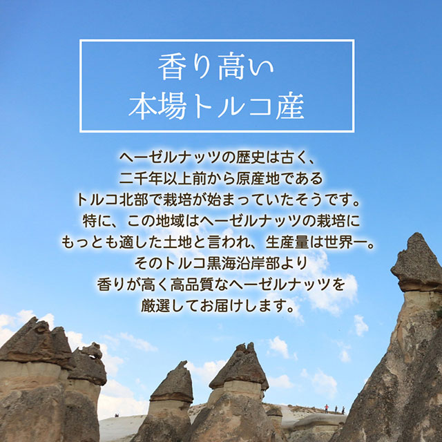 ヘーゼルナッツの歴史は古く、二千年以上前から原産地であるトルコ北部で栽培が始まっていたそうです。とくにこの地域はヘーゼルナッツお栽培にもっとも適した土地と言われ、生産量は世界一。そのトルコ黒海沿岸部より香りが高く高品質なヘーゼルナッツを厳選してお届けします。