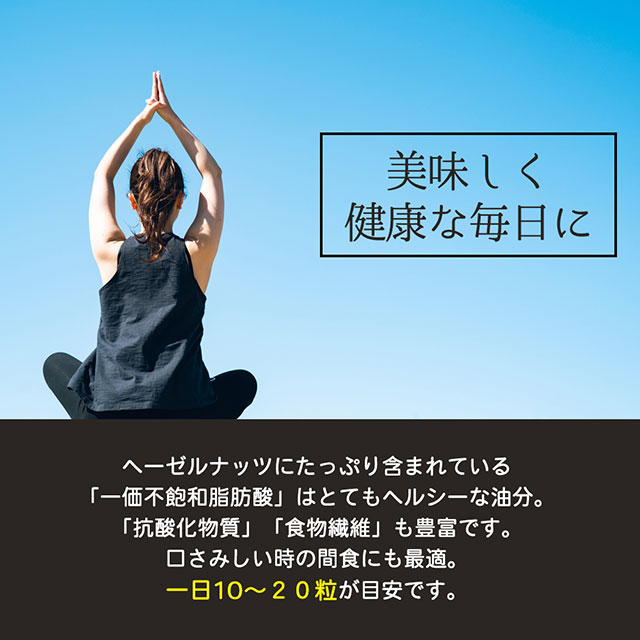 ヘーゼルナッツにたっぷり含まれている「一価不飽和脂肪酸」はとてもヘルシーな油分。「抗酸化物質」「食物繊維」も豊富なので、美容と健康におすすめのナッツです。一日10~20粒が摂取目安です。