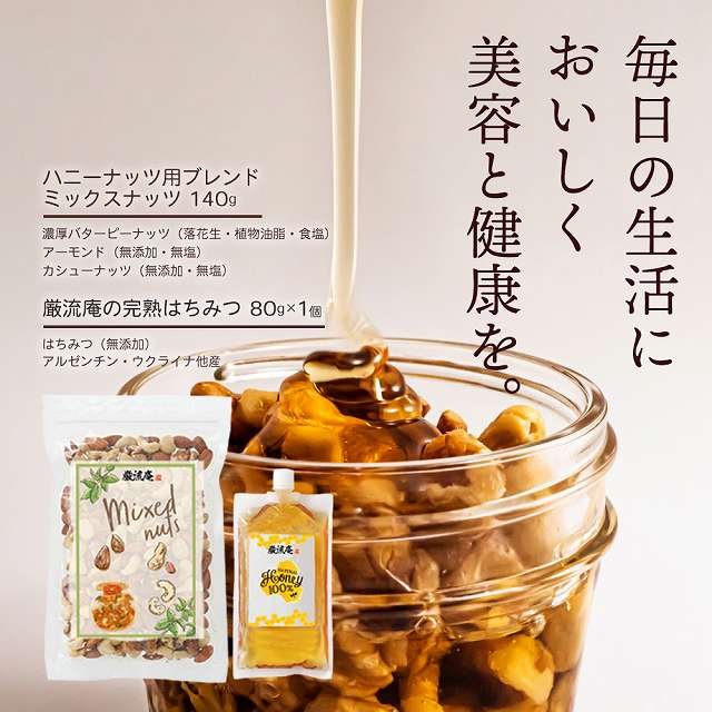 しかも、3回美味しいのが当店のセットの特長です!1つめはハニーナッツとして、2つめはミックスナッツとしておやつやお酒のおつまみに、3つめは蜂蜜としてトーストや紅茶に。