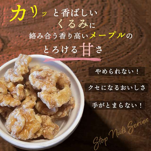ストップナッツシリーズの新商品に「メープルくるみ」が登場。カリッと香ばしいくるみに絡み合う香り高いメープルのとろける甘さ。メープルシロップでコーティングされることにより、カリサク感がキープ。とまらない美味しさです。